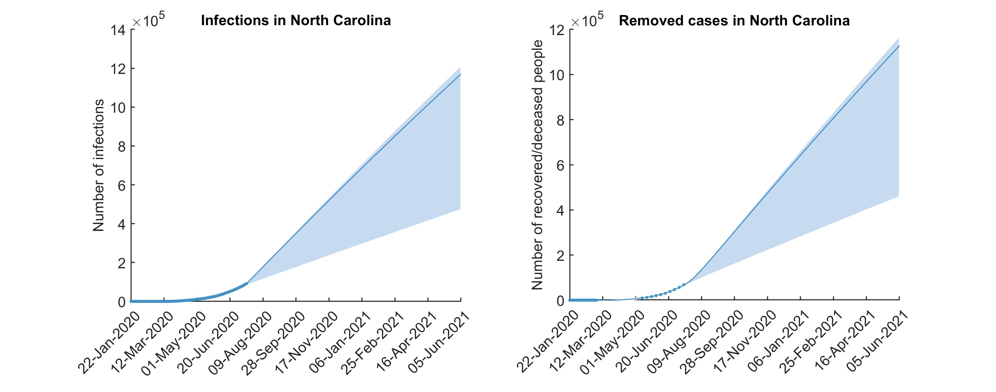 To see results for model fitting in a specific state, select a state from the dropdown menu below. Blue dots indicate actual data, blue solid lines are predictions made using the optimally fitting parameter sets, and blue shaded regions are predictions based on 500 random parameter sets.