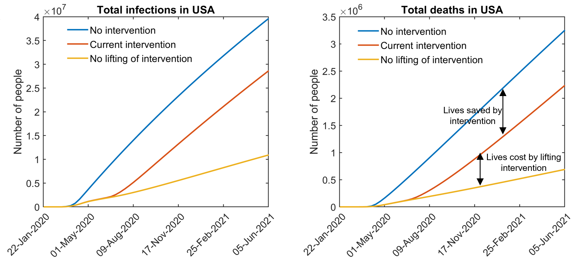 According to the model predictions, the current interventions in USA states have prevented the spread of COVID-19 by some extent, but lifting of these interventions will also potentially result in substantial numbers of infections and deaths.